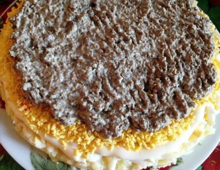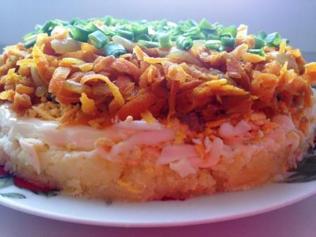 Сделать зажарку из лука и моркови, остудить и выложить верхним слоем салата. Украсить зеленью.