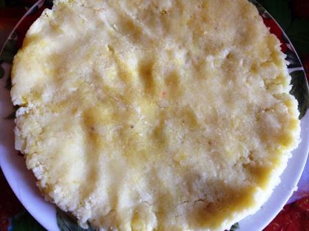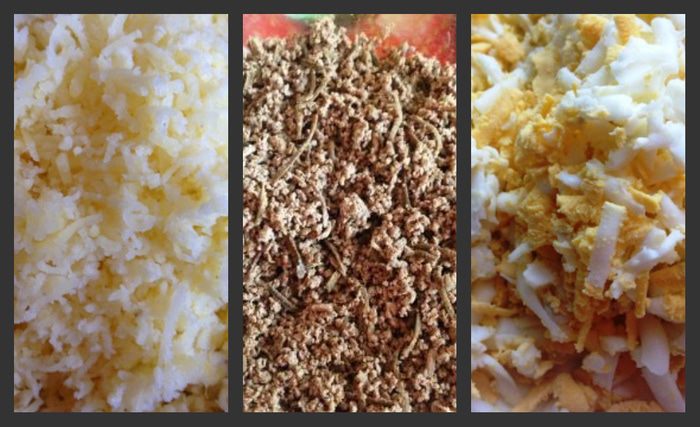 Вареный картофель, яйца и жареную печень натереть на терке.