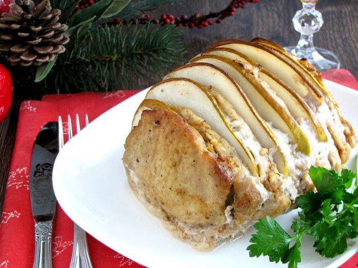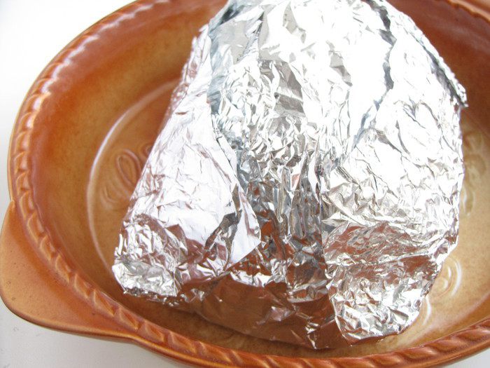 Выложить мясо на одну половину прямоугольного листа фольги, закрыть второй половиной и герметично подвернуть края с трех сторон. Нельзя допускать, чтобы сок, который будет образовываться при запекании, вытек наружу. Для страховки можно взять двойной лист фольги. Мясо запекать при температуре 180 град примерно 1 час 15 минут.
