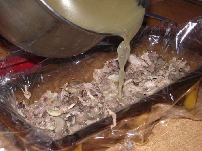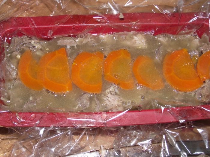 Форму застелить пленкой так, чтобы края могли закрыть зельц.