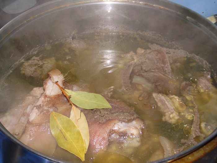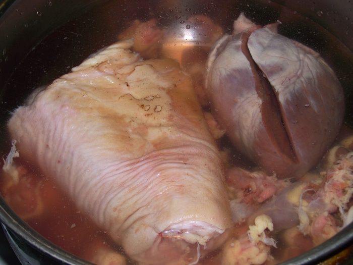 Свиную рульку, язык и сердце замочить на 1 час в холодной воде. Затем промыть под проточной водой.
