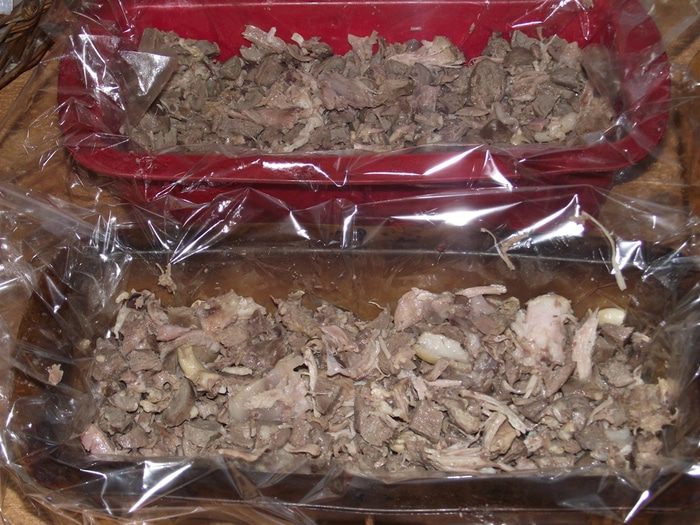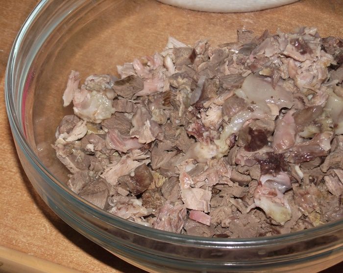 Мясо аккуратно отправить на сито и остудить. Язык очистить от кожуры. Желатин развести в теплом бульоне (на 1 литр бульона - 15 гр желатина). Рульку разобрать на маленькие кусочки, сердечки нарезать соломкой, морковь колечками. Добавить измельченный чеснок и свежемолотую смесь перцев.