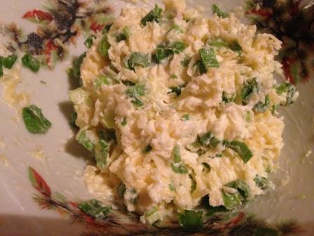 В блюдце смешать размягченное масло с тертым сыром, мелко нарезанной зеленью, сметаной и 3мя выдавленными зубчиками чеснока. Посолить по вкусу.