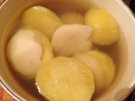 Картофель почистить, порезать вдоль пополам и отварить в соленой воде до полуготовности.