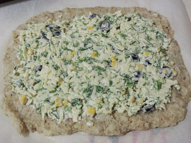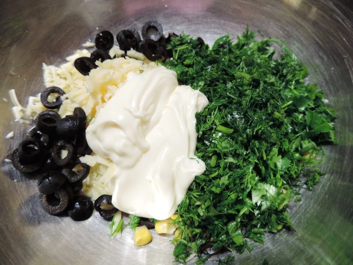 Тем временем приготовим начинку. На крупной терке натираем сыр, добавляем мелко нарезанные петрушку и укроп (точное количество зелени не указываю, но я люблю побольше), сметану, консервированную кукурузу (выбирайте), нарезанные кружочками маслины. Перемешиваем все до однородности.