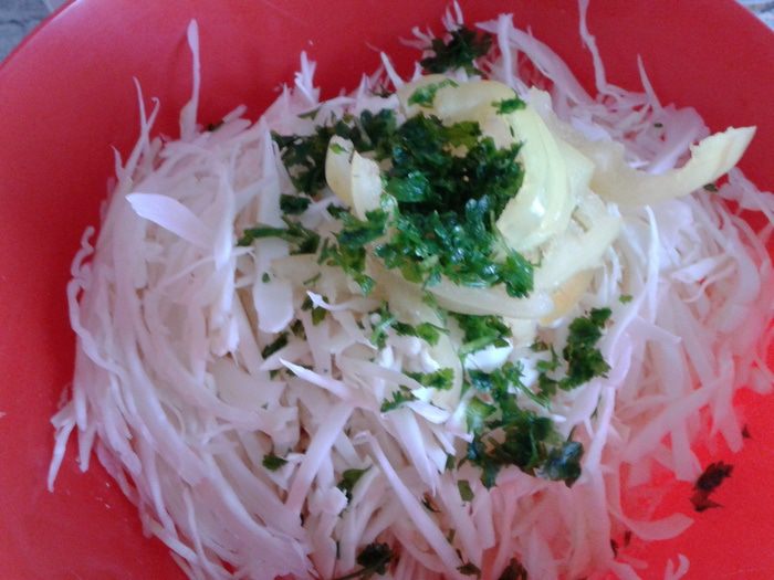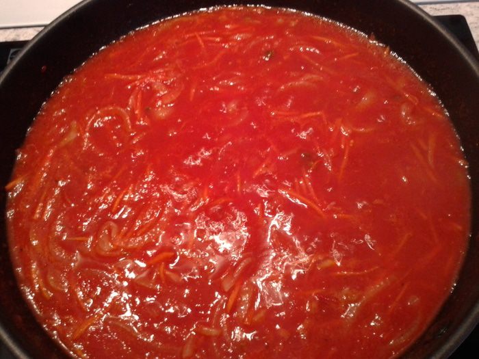 Тем временем готовим обжарку. Порезать лук полукольцами, а морковь соломкой. Обжарить слегка овощи на подсолнечном масле. Влить томат (у меня был домашний без косточек), соль, перец и специй овощных. Тушить минут 10-15.
