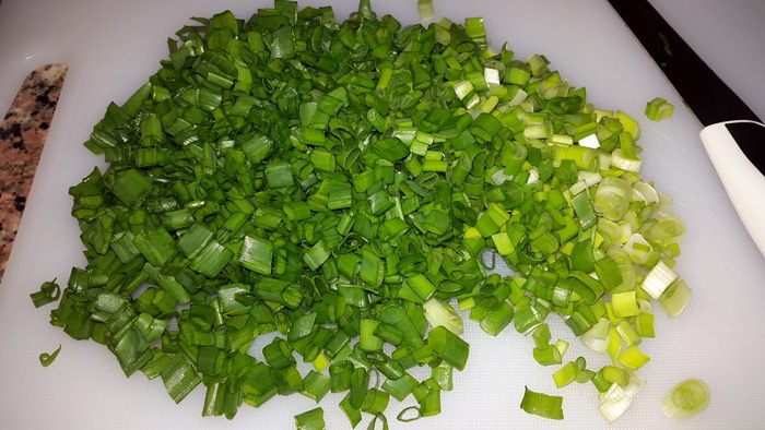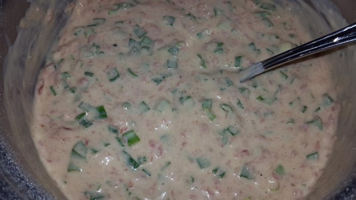 Добавить к яйцам теплый кефир, перемешать. Постепенно добавляя муку завести негустое тесто. Добавить половину лука, но с той стороны где он только зеленый. Перемешать и отставить в сторону.