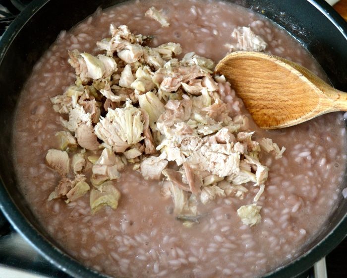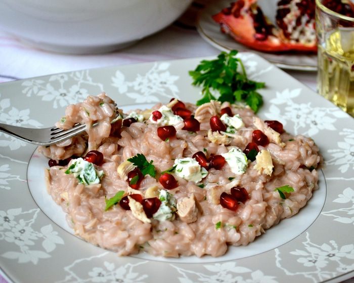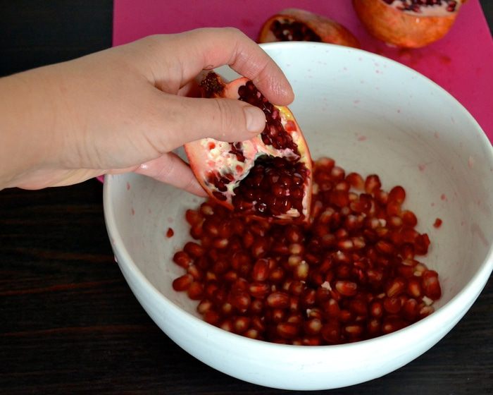 Очистить гранаты. По рецепту для этого предлагалось разрезать гранаты вдоль пополам. И, держа в руке над миской разрезанную половину, постучать ложкой по поверхности граната. Это позволит зернышкам граната без проблем высыпаться в миску. Лично мне пришлось разрезать каждый гранат на четыре части, чтобы таким образом очистить все зернышки.