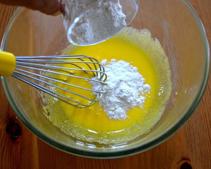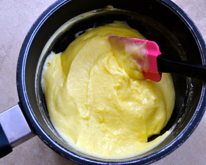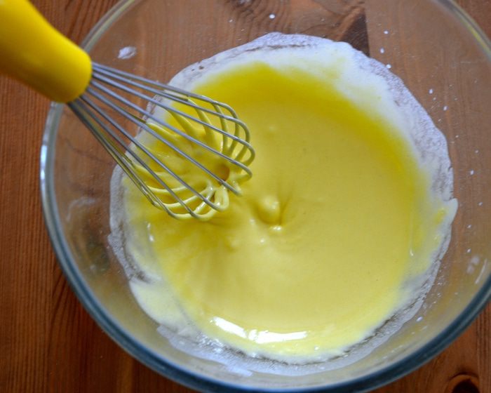 Итак, приготовить заварной крем. Молоко поставить нагреваться на огонь. Слегка взбить желтки с сахаром и щепоткой ванилина. Добавить просеянную муку и размешать, чтобы не было комочков.