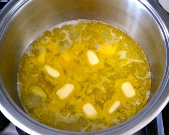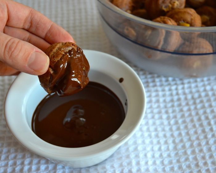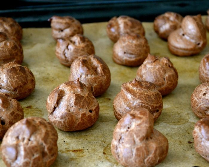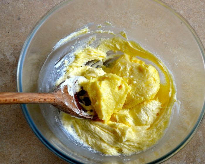 Тем временем займемся приготовлением крема мусслин. Фактически, это итальянский заварной крем (на желтках!), который смешивается с размягченным сливочным маслом. В нашем случае еще добавляется шоколад, т.к. профитроли мы будет наполнять шоколадным мусслином!