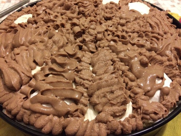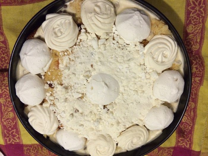 После этапа охлаждения торта, делаем верхний слой: утапливаем по кругу кругляши безе, заполняем пустоты между ними кремом, отложенным от основного (удобно с помощью кондитерского мешка).