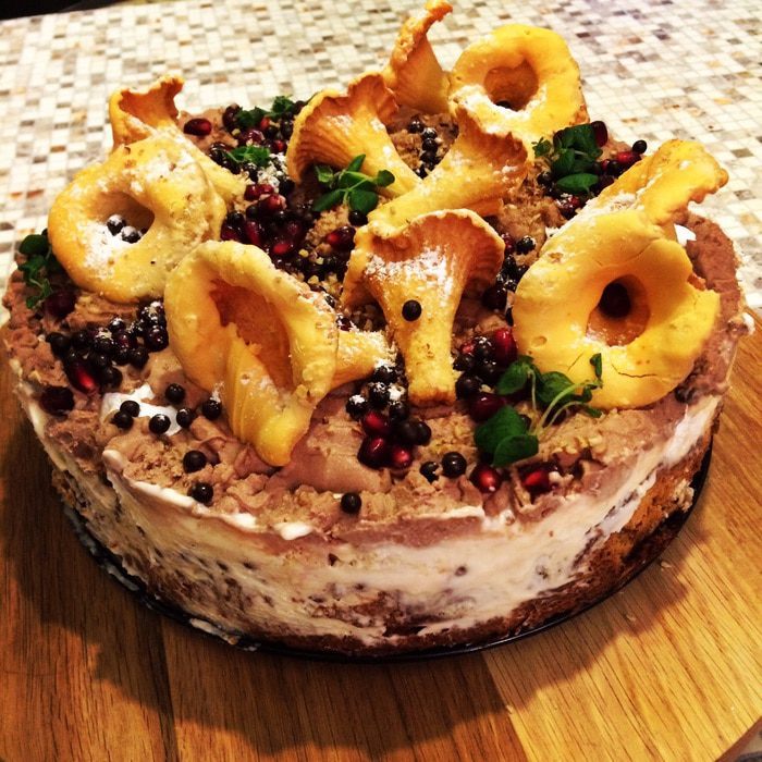 Пояснения : Маскарпоне для украшения брала шоколадный (его продают сейчас во многих местах, но, думаю, можно к обычному ввести или грамм 50 растопленного шоколада или какао с маслом сливочным, ну, все взрослые - придумаете замену если что;) Печенья у меня - в виде лисичек, главная мыль создать иллюзию несладкого торта, фантазиия Ваша ни чем не ограничена:) Безе взяла свои готовые круглые, но можно и магазинные, конечно. Каштаны в крем идут в идеале готовые засахаренные - трудно найти, можно пралине каким-нибудь заменить.