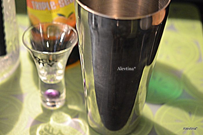 Приготовим все для коктейля. Количество идет на 1 порцию. Ликер "Трипл Сек" или любой другой с апельсиновым вкусом.