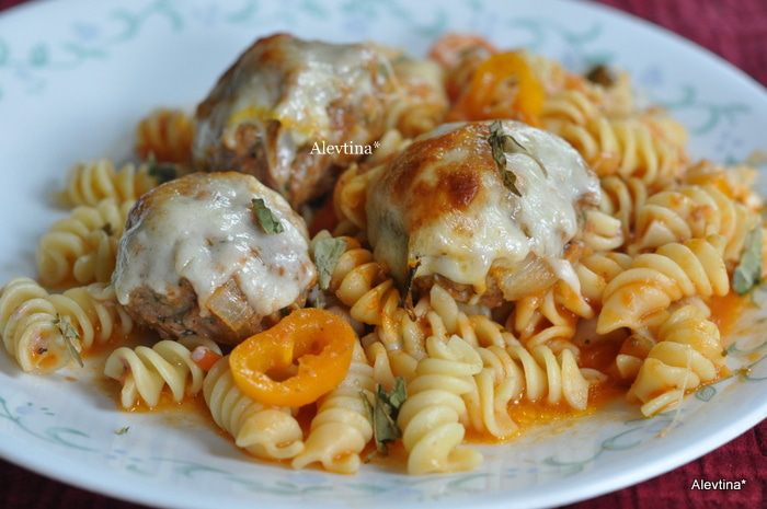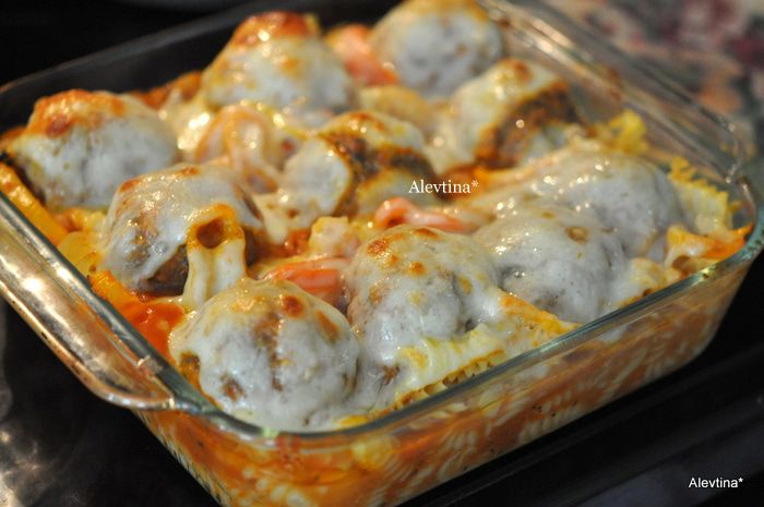 Переложим в смазанную форму готовую пасту, фрикадельки с овощами и соусом.