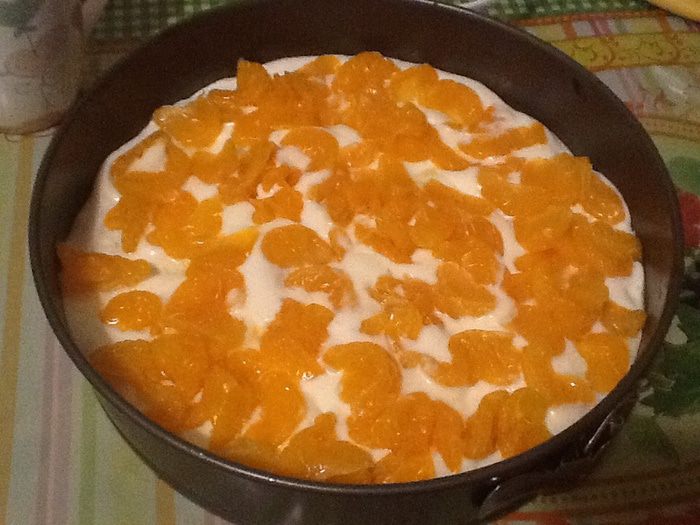 На дно разъемной формы выкладываем первую половинку коржа. Сверху выливаем 1/2 крема и распределяем мандарины. Далее заливаем оставшийся крем и накрываем второй половинкой коржа.