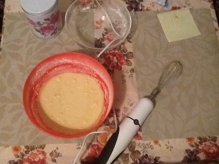 Выложить тесто в форму (у меня 30 см). Выпекать 25-30 минут при температуре 180 градусов.Остудить и разрезать корж на две части.