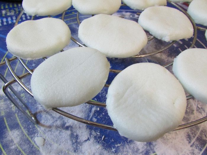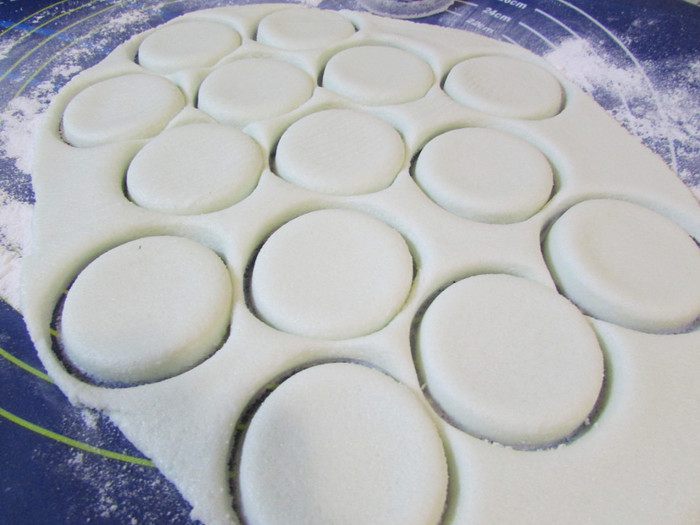 Присыпьте рабочую поверхность сахарной пудрой и раскатайте массу до толщины 5 мм. Вырежьте 30 кружков формами диаметром 3,5 см.