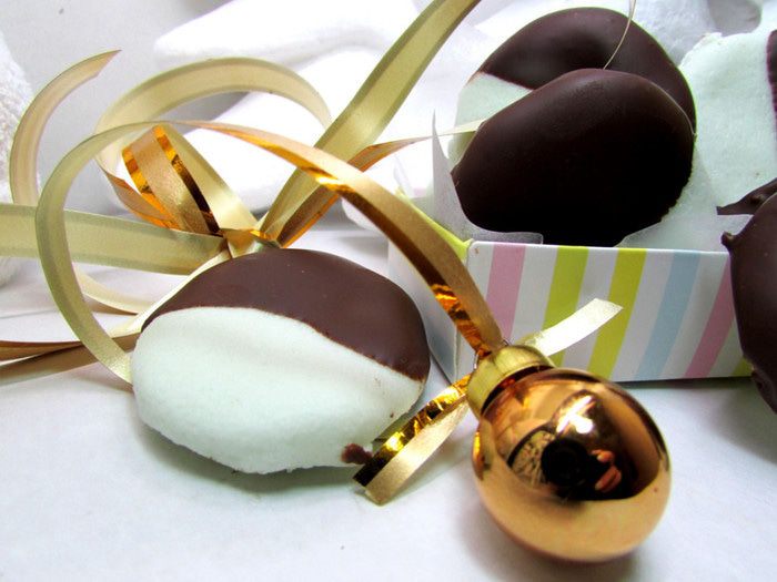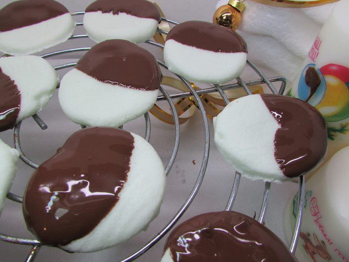 Обмакните каждую в растопленный шоколад до середины. Оставьте застывать на решетке.