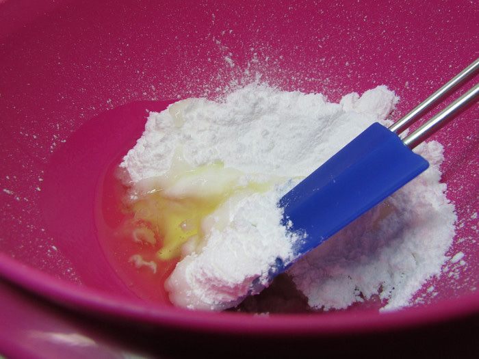 Вмешайте в яичный белок две трети сахарной пудры.