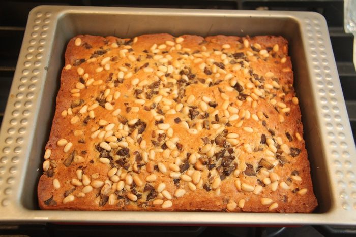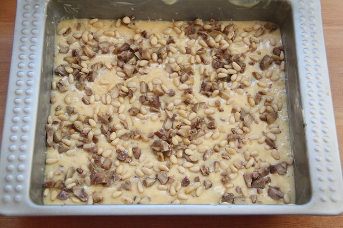 Смешать оставшиеся рубленые каштаны, кедровые орехи и соль и выложить сверху теста. В оригинальном рецепте соли была чайная ложка, но мне показалось это слишком смело...может кто и рискнёт...