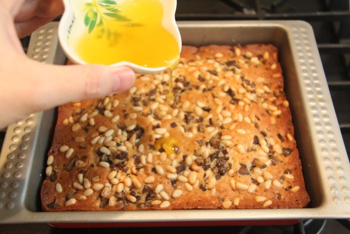 Готовый пирог оставить в форме на 5 минут, затем переложить на решётку. Полить верх пирога 2 ст.л. тёплого мёда.