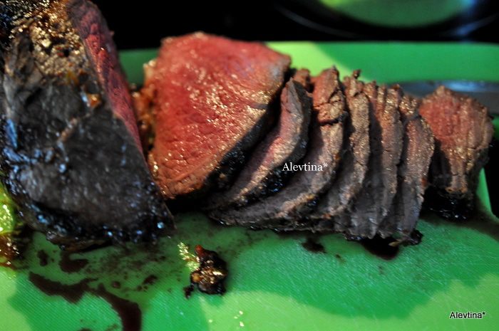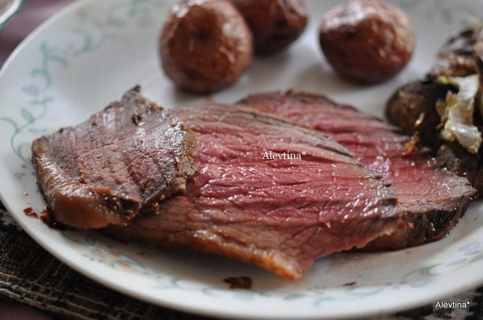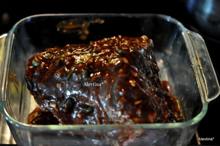 Выкладываем говяжий огузок в маринад. Закрываем пленкой и ставим мариноваться в холодильник на ночь.