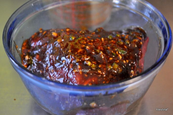 Смешиваем все для маринования в емкости. Халапеньо перец или красный перец острый чистим и нарезаем мелко. Имбирь на терке.
