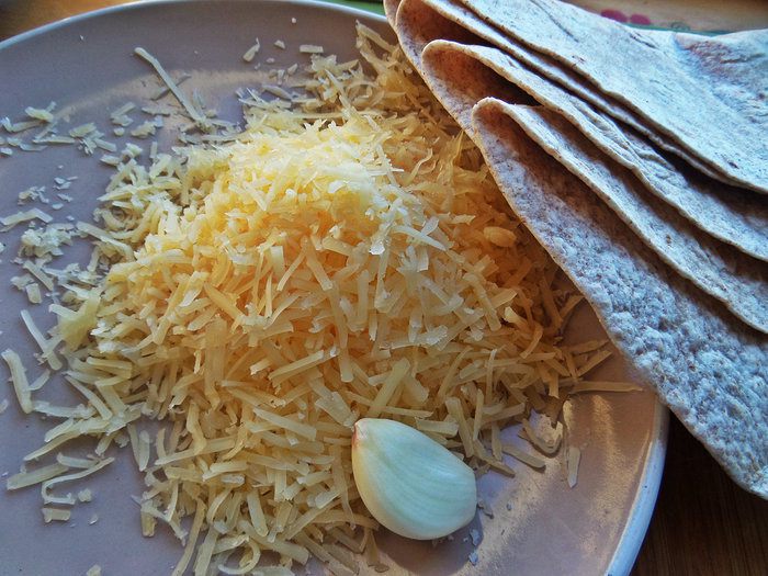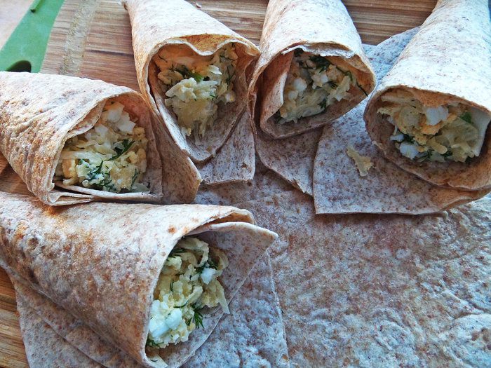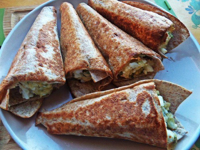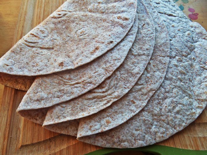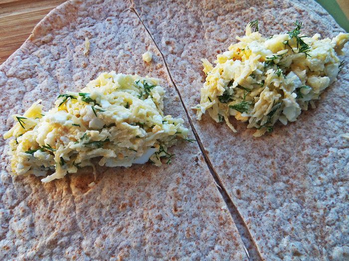 Тортилью разрезать пополам,на каждую часть положить ложку начинки.