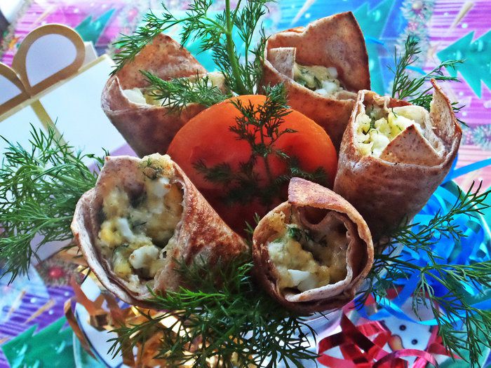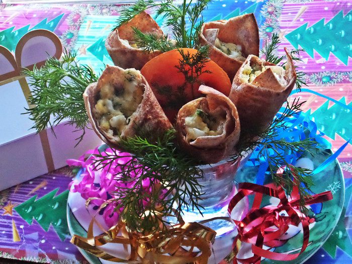Для декора уместно вставить веточки укропа и дольку помидора. Закуска сразу съедается,на компанию нужно делать больше!