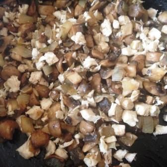 Добавить в сковороду порезанные кубиками грибы и филе и жарить минут 5.