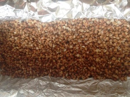 Глубокую форму застелить фольгой, смазать маслом и выложить половину гречки.