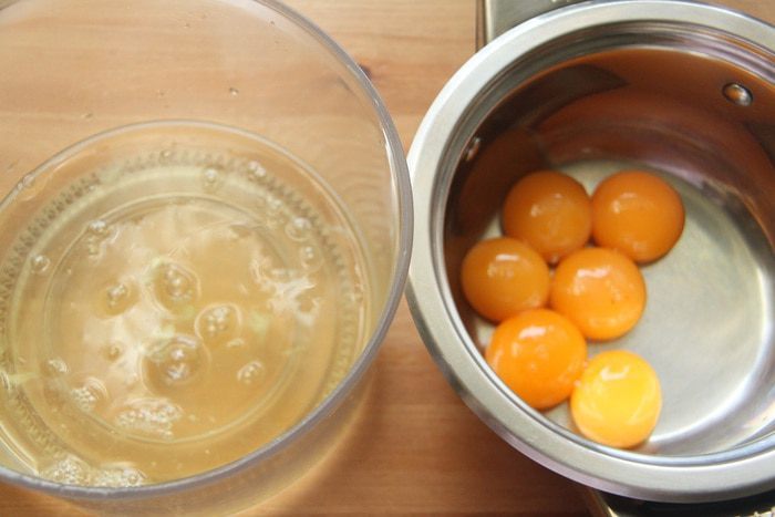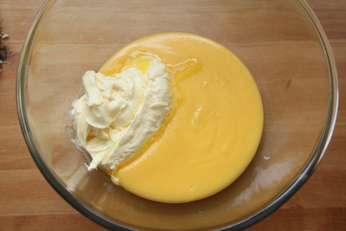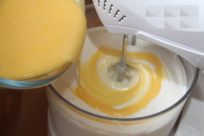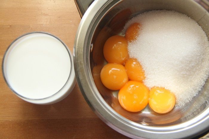 Шесть желтков соединить с половиной сахара, растереть или смешать с помощью миксера, добавить муку, добавить тёплого молока. Поставить массу на слабый огонь и, постоянно помешивая, довести до густоты сметаны. Полученный заварной крем остудить под крышкой (чтобы на поверхности крема не образовалась плёнка).