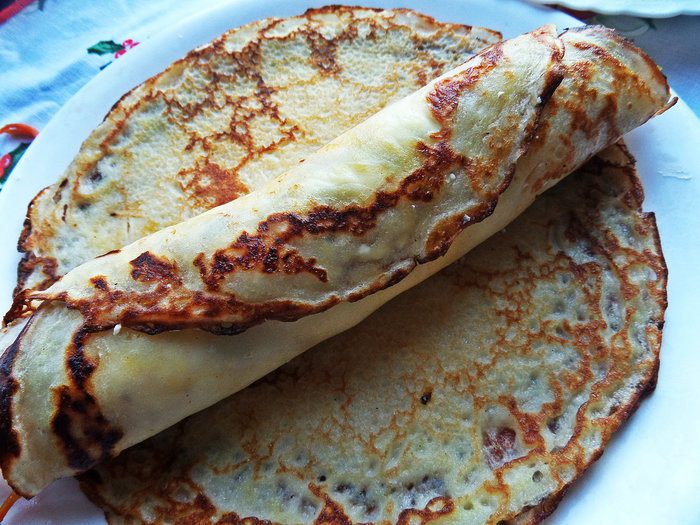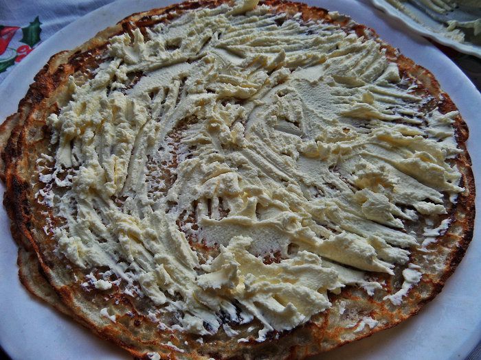 Промазываем каждый блин маскарпоне (примерно 2-3 ложки).