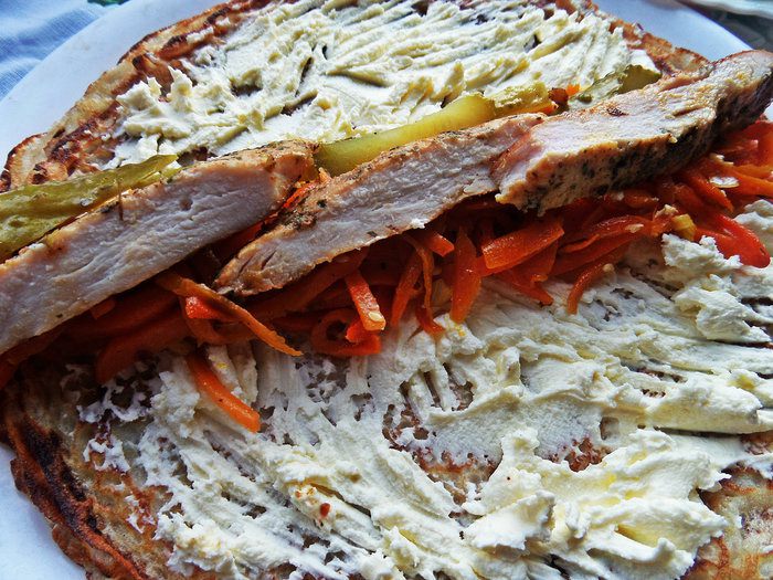 Сверху ломтики готовой курицы/индейки. Одного филе хватает на 5 блинов.