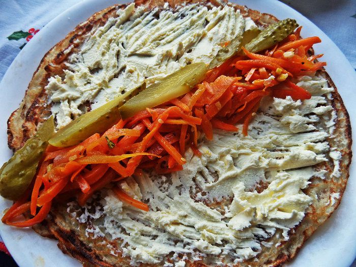 Укладываем лентой пару ложек морковки по-корейски и маринованный огурчик нарезанный.