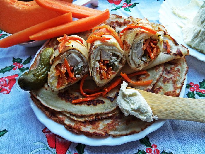 Нежные блинчики очень хорошо сочетаются с хрустящим огурчиком и морковкой,а курочка и сыр добавят вкуса и сытности!