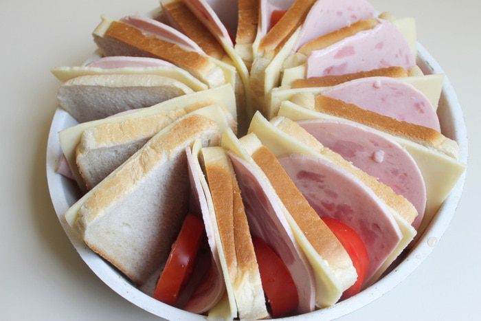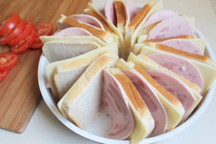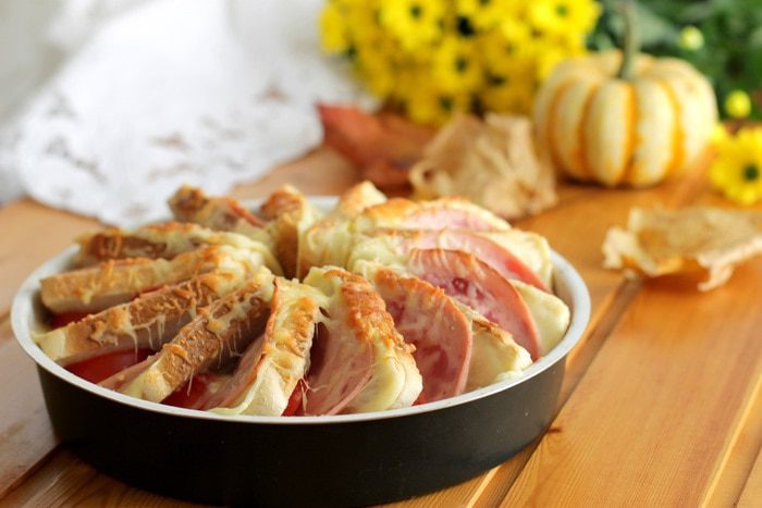 Хлеб слегка смажем маслом. Выкладываем в форму. И между слоями кладем пластинку сыра и пластинку ветчины. Помидоры порежем тонко.