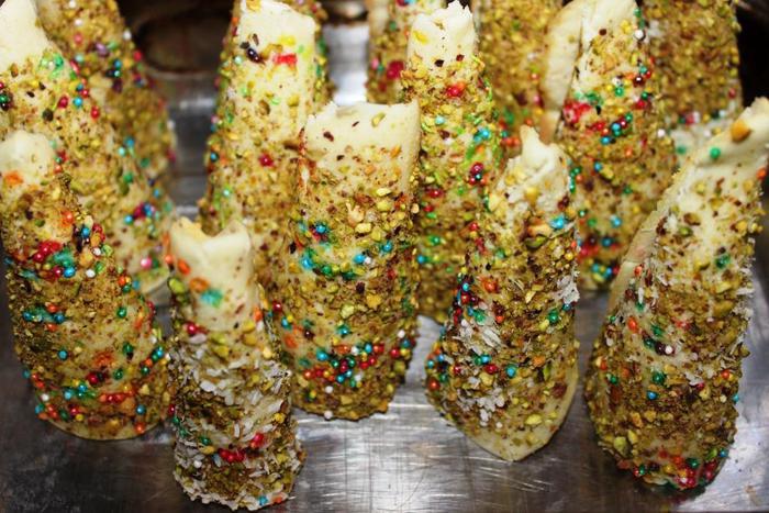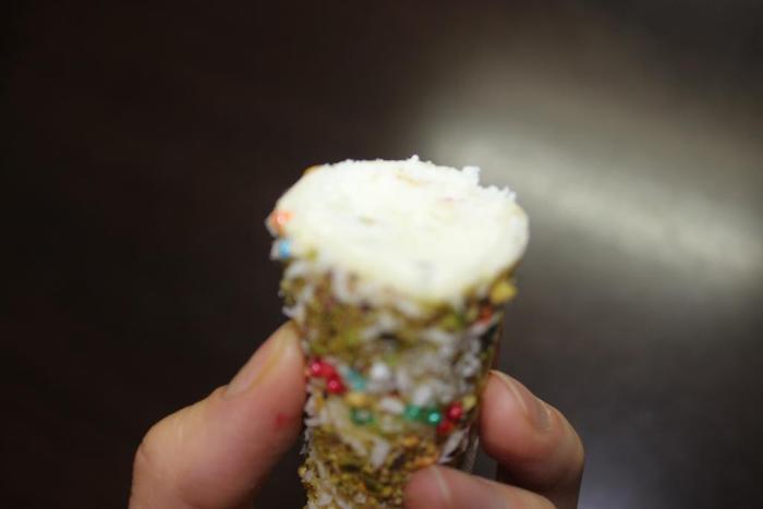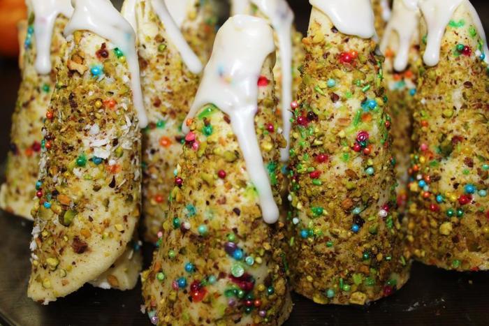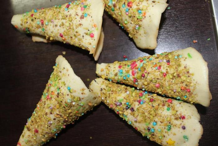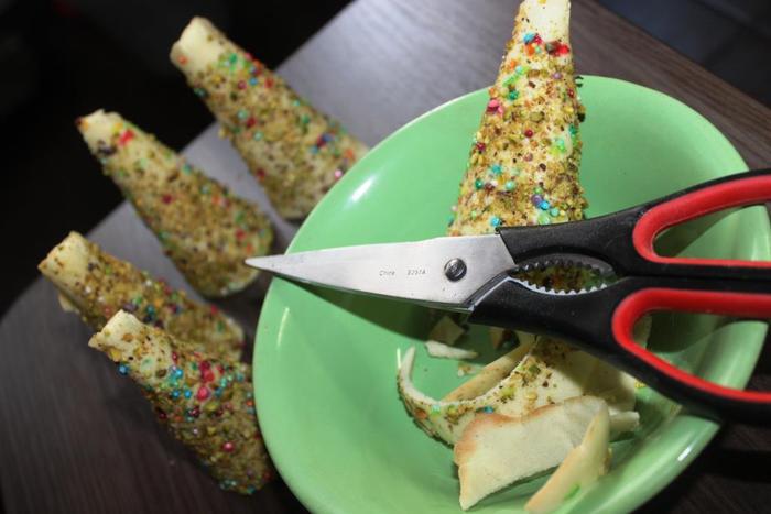Снимаем круги ПО ОДНОМУ! С пергамента, поддевая края ножом, и руками сворачиваем их конусом посыпкой наружу, тщательно придавливая места стыков, чтобы они хорошо скрепились. Елочки, пока горячие, хорошо крепятся в местах, где посыпки меньше. Если вы когда-нибудь работали с такого рода изделиями, пекли, например, печенье "Каллы", то у вас проблем точно с этим делом не возникнет.