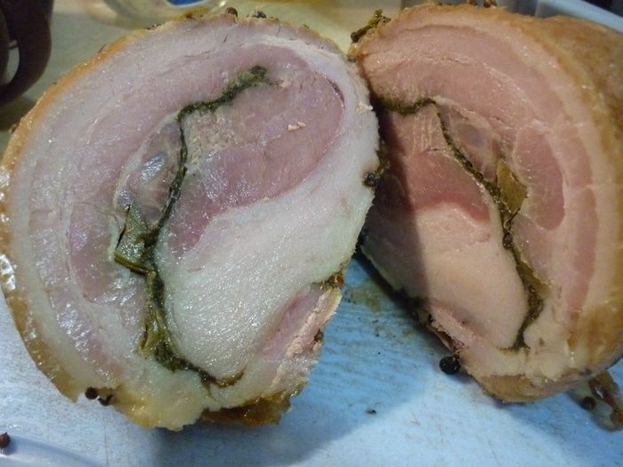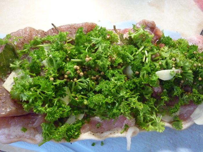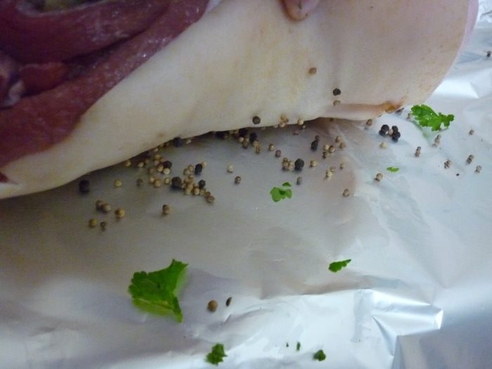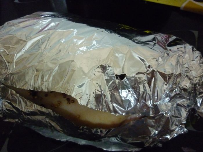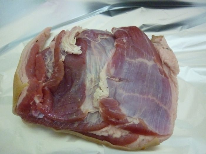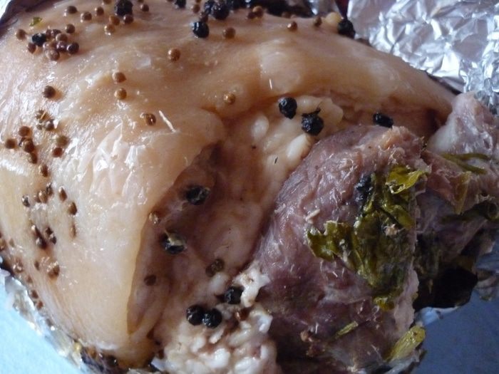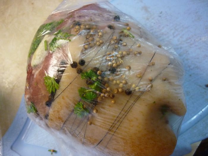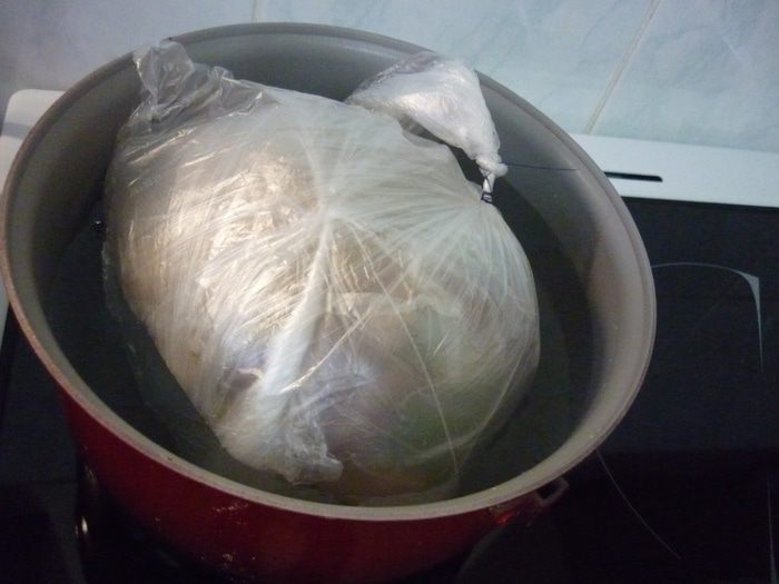 Если вы решили воспользоваться фольгой, то сало в фольге тоже помещаем в пакет. Пакет надо плотно завязать, максимально выдавив из него воздух. И так по очереди сало надо упаковать в 5 пакетов. И теперь все помещаем в большую кастрюлю с холодной водой, накрываем крышкой, чтоб мясной сверток не всплывал сильно, ставим на САМЫЙ слабый огонь не менее, чем на... 7-8 часов. Да, да. так долго. Я уже приспособилась, т.к. готовила за месяц сало 4 раза, ставлю 5-литровую кастрюлю на "единичку" ( у меня электроплита), и ложусь спать. И дед делал также. Почему так долго? Потому что самое главное - ВОДА НЕ ДОЛЖНА КИПЕТЬ. Оптимальная температура - 80-90 градусов, при ней мясо томится, становится нежным. Я пробовала делать в мультиварке в режиме "подогрев". Но там температура всего 70 градусов, сало осталось жестким, мясо тоже. Поэтому вот такой вот долгий вариант. Но поверьте, игра стоит свеч.