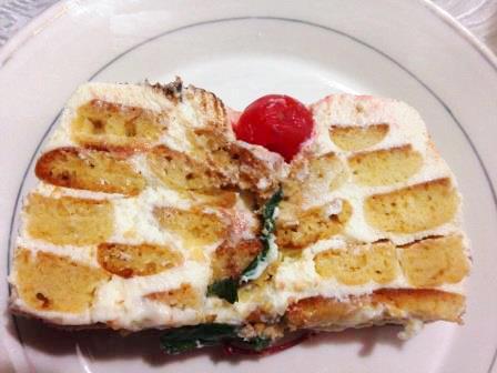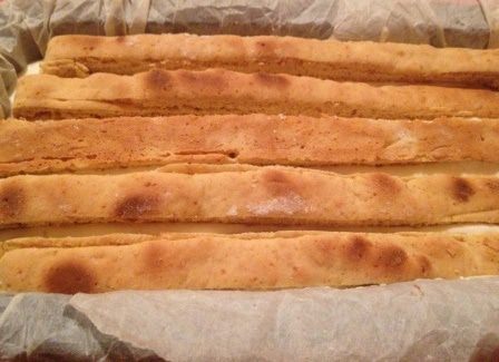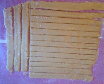 Разделить тесто на 3 части. Каждую из них раскатать на пергаменте в прямоугольный пласт 0,5 см толщиной и нарезать на полоски 2 см шириной, отделить их друг от друга (или после выпекания можно будет прорезать), вместе с пергаментом перенести в разогретую до 220 градусов духовку на несколько минут, до румяности. Горячими подравнять под размер формы.