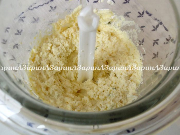 В чашу измельчителя сложить все ингредиенты: остывший лук, яйца, твердый сыр, крем – чиз, тимьян, соль, два вида перца, измельченный чеснок, а также добавить майонез. Все составляющие хорошо измельчить в гомогенную массу.