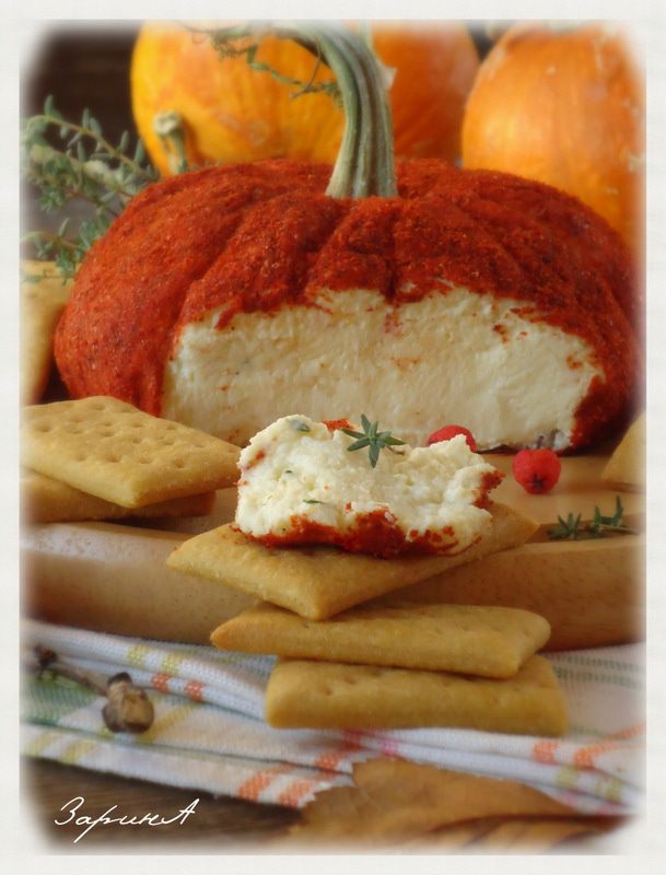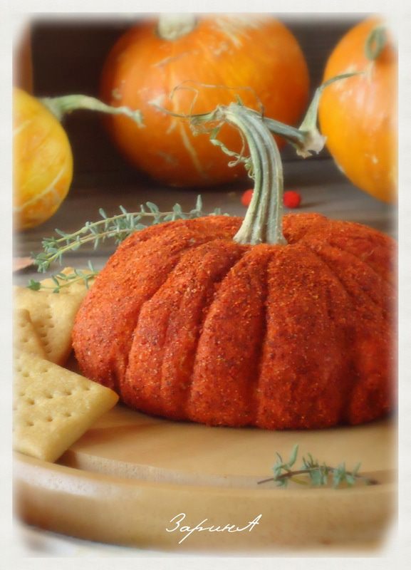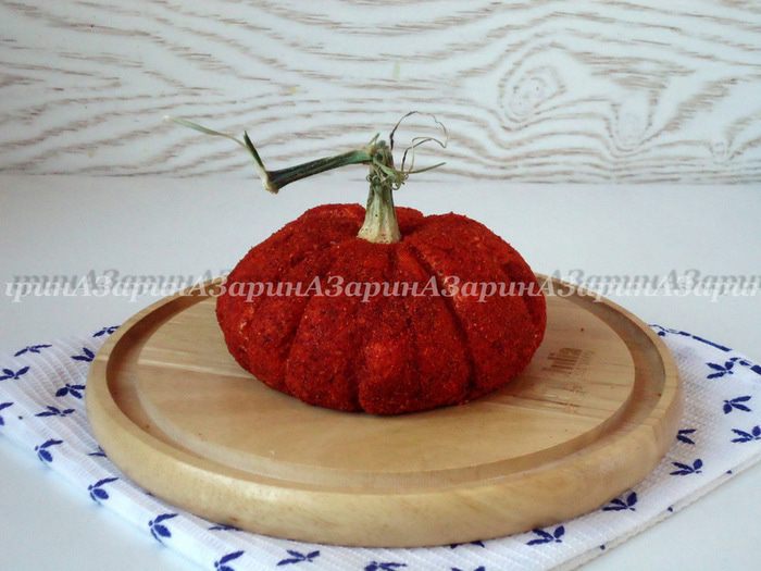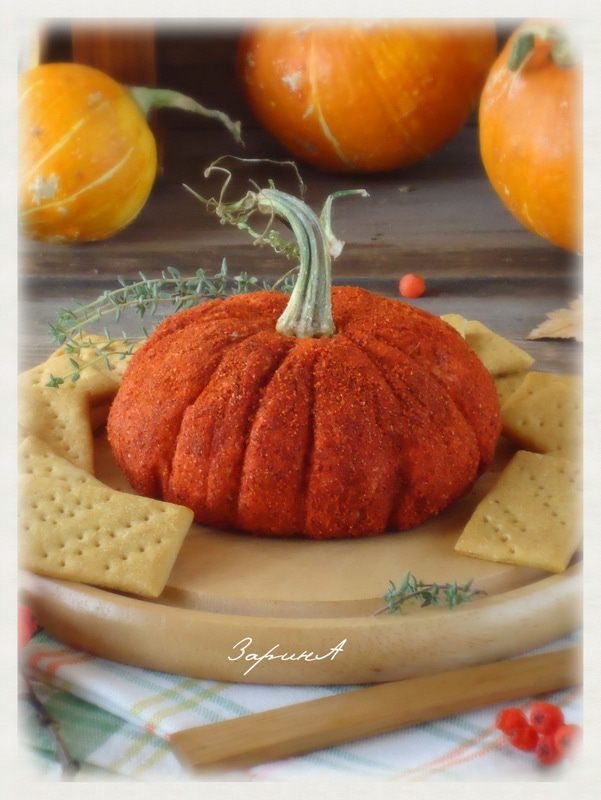 Года три назад на просторах интернета я наткнулась на закуску в форме тыквы. Состав был другой, в основном состоял из различных сыров. Со временем я переделала состав под личные вкусовые предпочтения и из более доступных для меня продуктов. Количество продуктов можно варьировать, убавляя и прибавляя, главное, что бы масса не получилась жидкой и что бы удобно было сформовать шар - тыкву. Надеюсь, моя "Рыжая тыква" и вам придется по вкусу. Тыковка очень эффектно выглядит на праздничном столе. Угощайтесь!