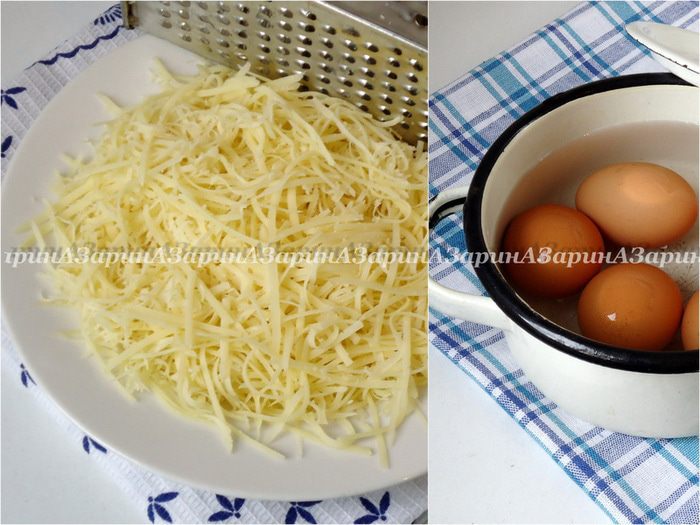 Яйца сварить, очистить и натереть на терке. Твердый сыр также натереть на терке.