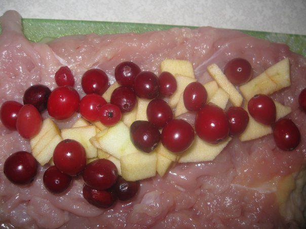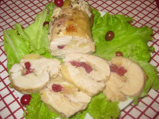 Предлагаю Вашему вниманию вкусный, полезный и очень нежный рулет из мяса индейки. Его прекрасно дополняет кисленькая клюква и сладкое яблоко!