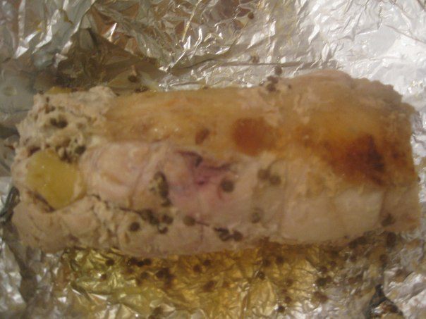 Оборачиваем фольгой. И кладем в холодильник минимум на 1 час. Потом в фольге запекаем в нагретой духовке 45-50 минут.