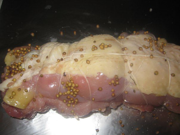 Сворачиваем плотно в рулет и перевязываем нитью. Немного солим, добавляем кориандр.