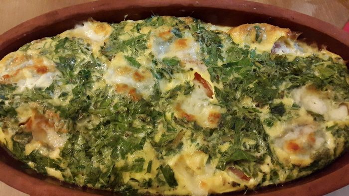 Очень вкусный и полезный завтрак - омлет с помидорами, зеленью и сыром запеченный в глиняной тарелке.