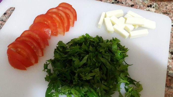 Помидор нарезать полу-кружочками, сыр - брусочками, петрушку порубить.