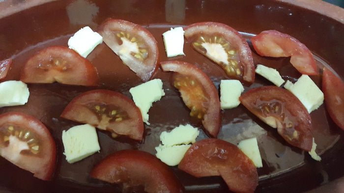 В глиняную тарелку равномерно выложить сливочное масло кусочками и помидоры.