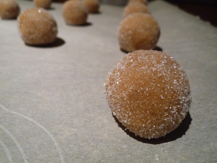 Из остывшего теста, набирая по чайной ложке, сформировать шарики. Каждый вывалят в сахаре и разместить на противне на расстоянии 5 см.